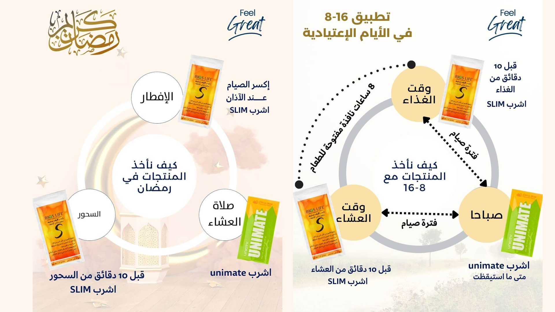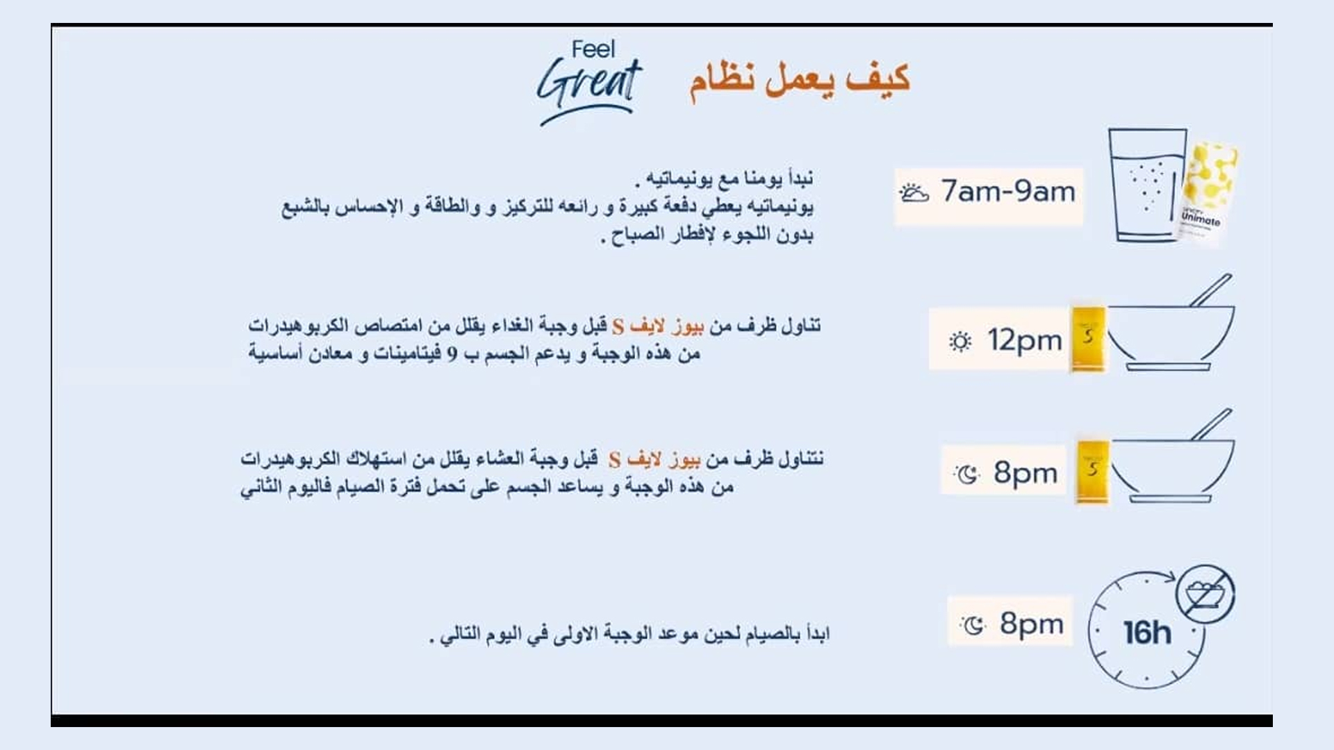 نظام قائم على وقت الطعام ومنتجين من أفضل المكملات الغذائية عالميا والمصممة علميًا والتي تعمل بشكل متكامل. نظام بسيط، استيقظ وابدأ الصباح مع يونيماتي ثم قبل كل وجبة خذ منتج سليم وتناول طعامك بالشكل المعتاد، التطبيق في رمضان موجود أدناه، لا تحتاج لحمية أوحرمان